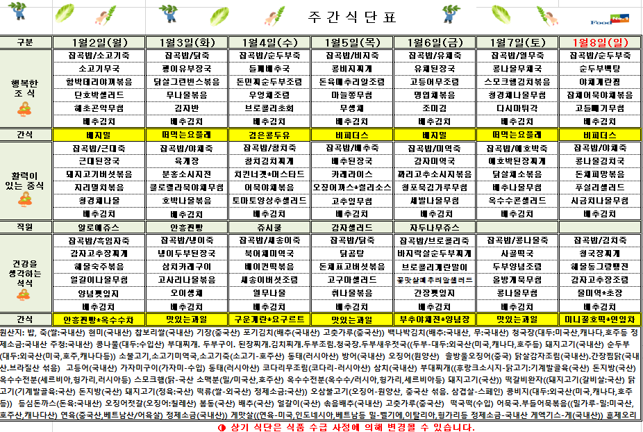 1¿ù 1ÁÖÂ÷ ½Ä´ÜÇ¥(2023.1.2~2023.01.08)
