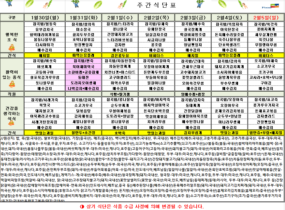 2¿ù 1ÁÖÂ÷ ½Ä´ÜÇ¥(2023.1.30~2023.02.05)