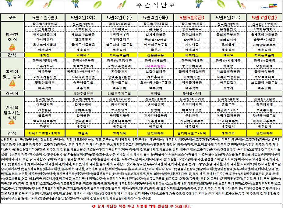 5¿ù 1ÁÖÂ÷ ½Ä´ÜÇ¥(2023.5.1~2023.5.7)