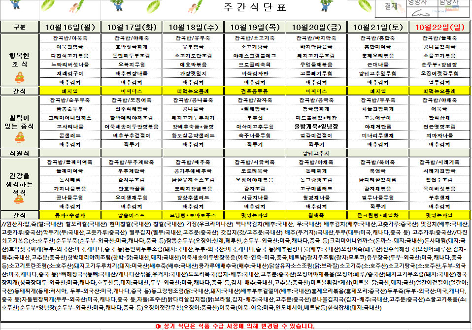 10¿ù 3ÁÖÂ÷ ½Ä´ÜÇ¥(2023.10.16~2023.10.22)