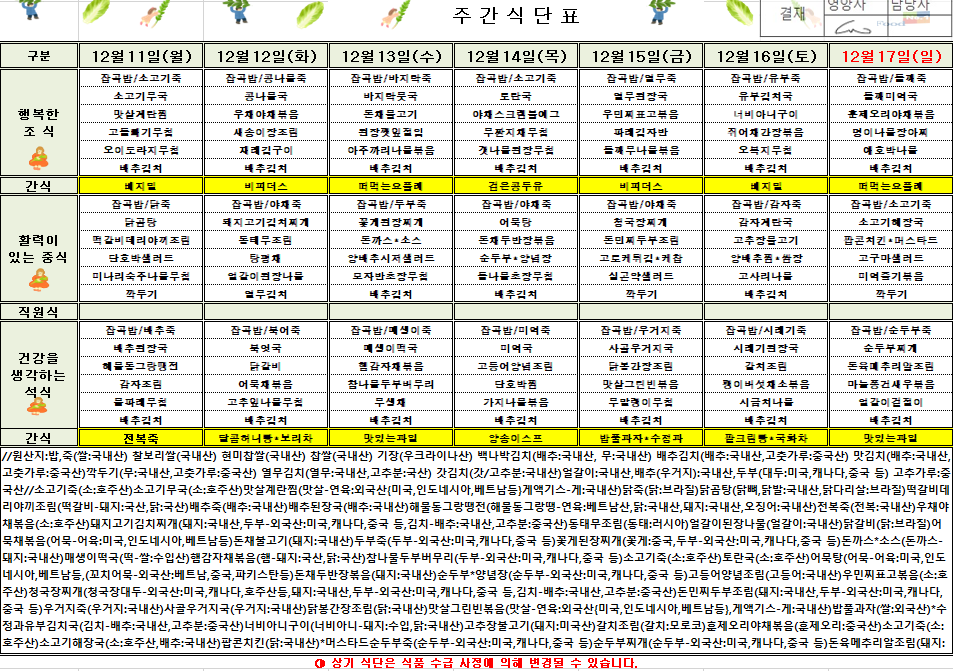 12¿ù 2ÁÖÂ÷ ½Ä´ÜÇ¥(2023.12.11~2023.12.17)