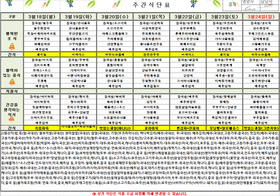3¿ù 3ÁÖÂ÷ ½Ä´ÜÇ¥(2024.03.18~2024.03.24)