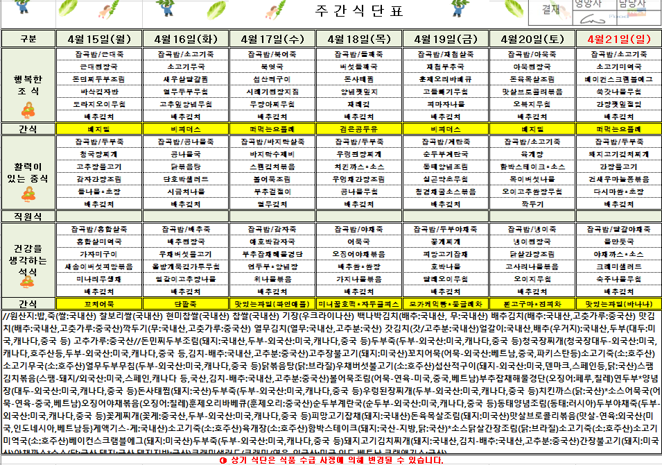 4¿ù 3ÁÖÂ÷ ½Ä´ÜÇ¥(2024.04.15~2024.04.21)