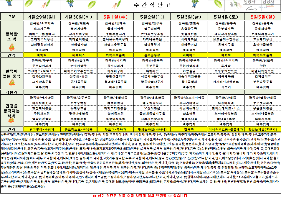 5¿ù 1ÁÖÂ÷ ½Ä´ÜÇ¥(2024.04.29~2024.05.05)