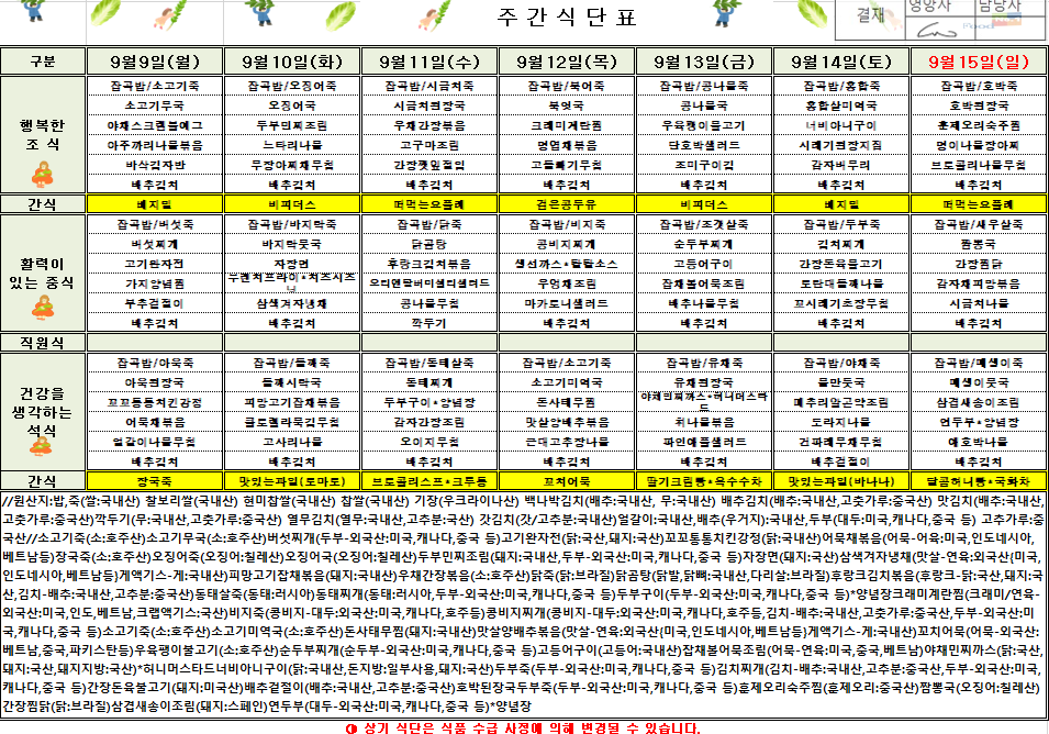 9¿ù 2ÁÖÂ÷ ½Ä´ÜÇ¥(2024.09.09~2024.09.15)