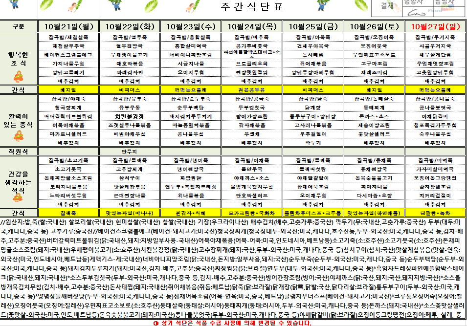 10¿ù 4ÁÖÂ÷ ½Ä´ÜÇ¥(2024.10.21~2024.10.27)