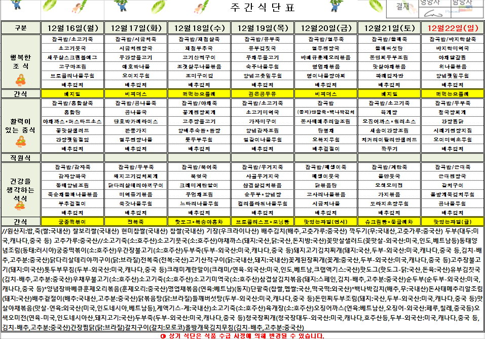 12¿ù 3ÁÖÂ÷ ½Ä´ÜÇ¥(2024.12.16~2024.12.22)