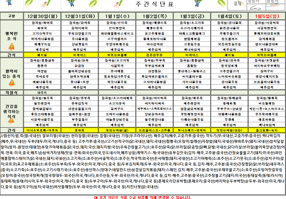 1¿ù 1ÁÖÂ÷ ½Ä´ÜÇ¥(2024.12.30~2025.1.5)