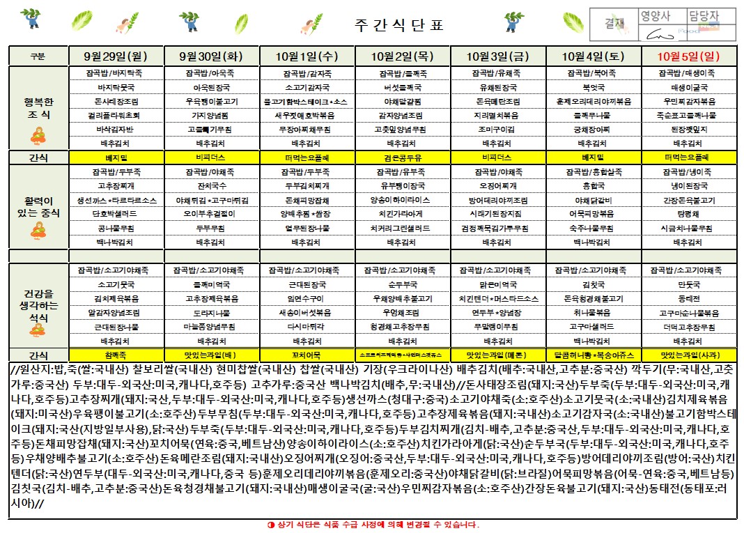 10¿ù 1ÁÖÂ÷ ½Ä´ÜÇ¥(2025.09.29~2025.10.05)