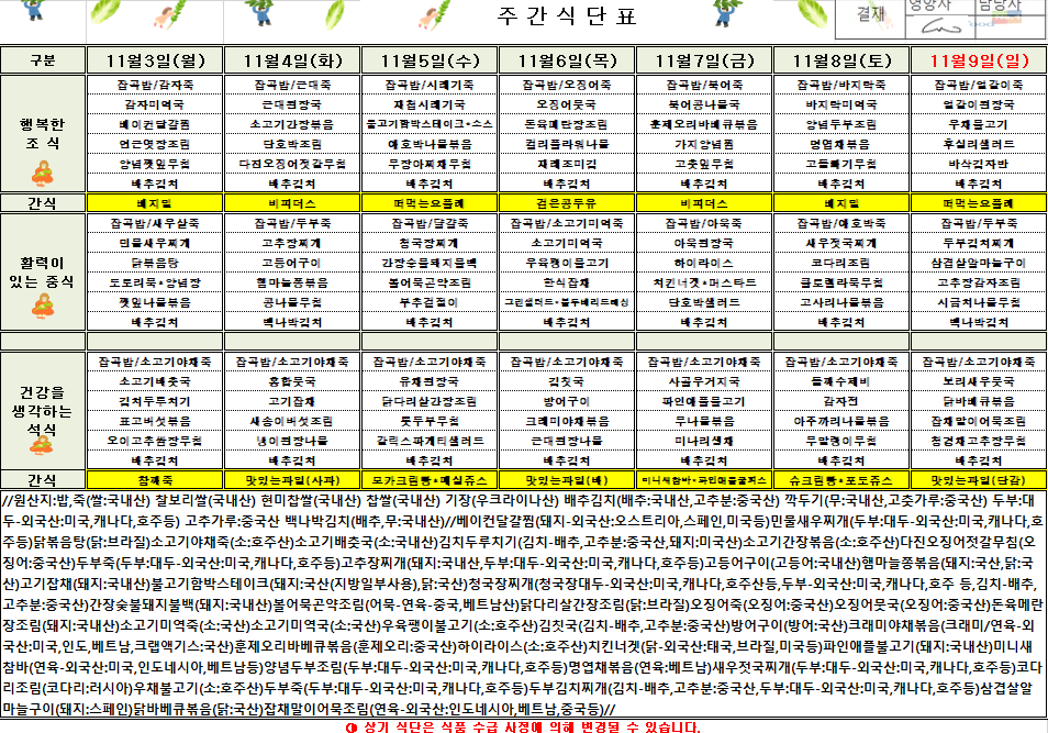 11¿ù 1ÁÖÂ÷ ½Ä´ÜÇ¥(2025.11.3~2025.11.9)