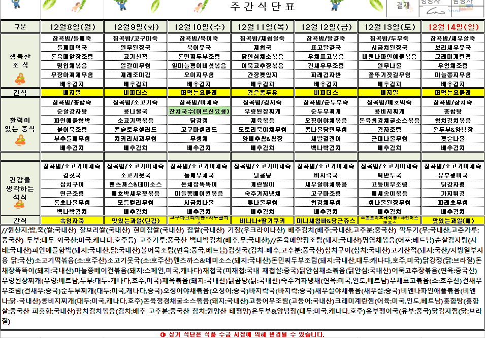 12¿ù 2ÁÖÂ÷ ½Ä´ÜÇ¥(2025.12.8~2025.12.14)